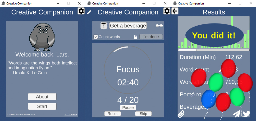 Keep track of your creative routine by word count🧮, Words Per Hour🕰️, Streak🔥 … even refills of your favorite beverage☕.